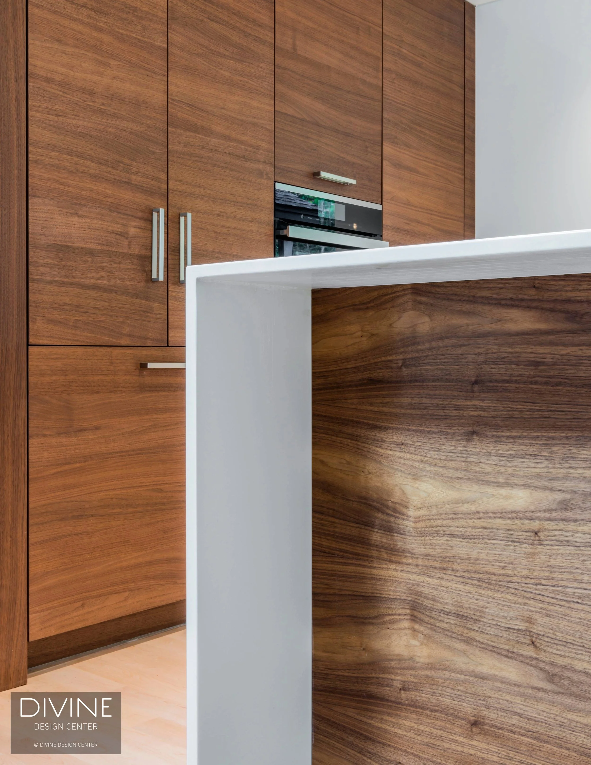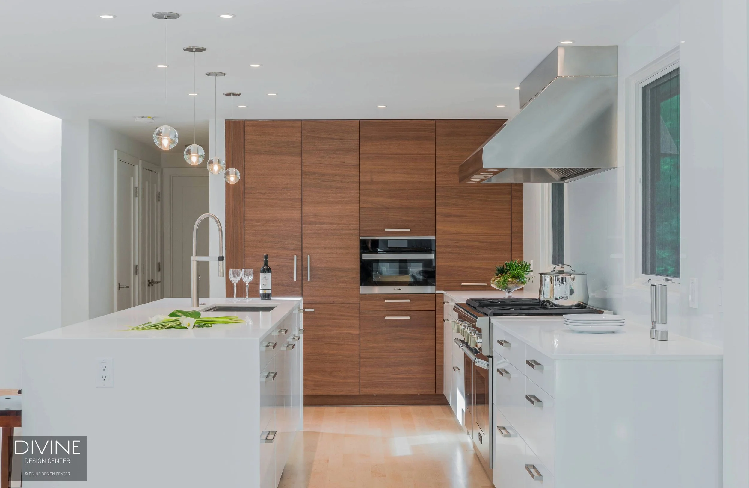 Modern minimalist kitchen design tends to feel cold and bare. We avoid this by creating luxury kitchens that feature warm tones with sleek modern accents. By adding natural wood tones, we bring warmth and natural elegance to this German kitchen. This Leicht kitchen's dark oak cabinets and big kitchen island bring warmth to the white kitchen cabinets.