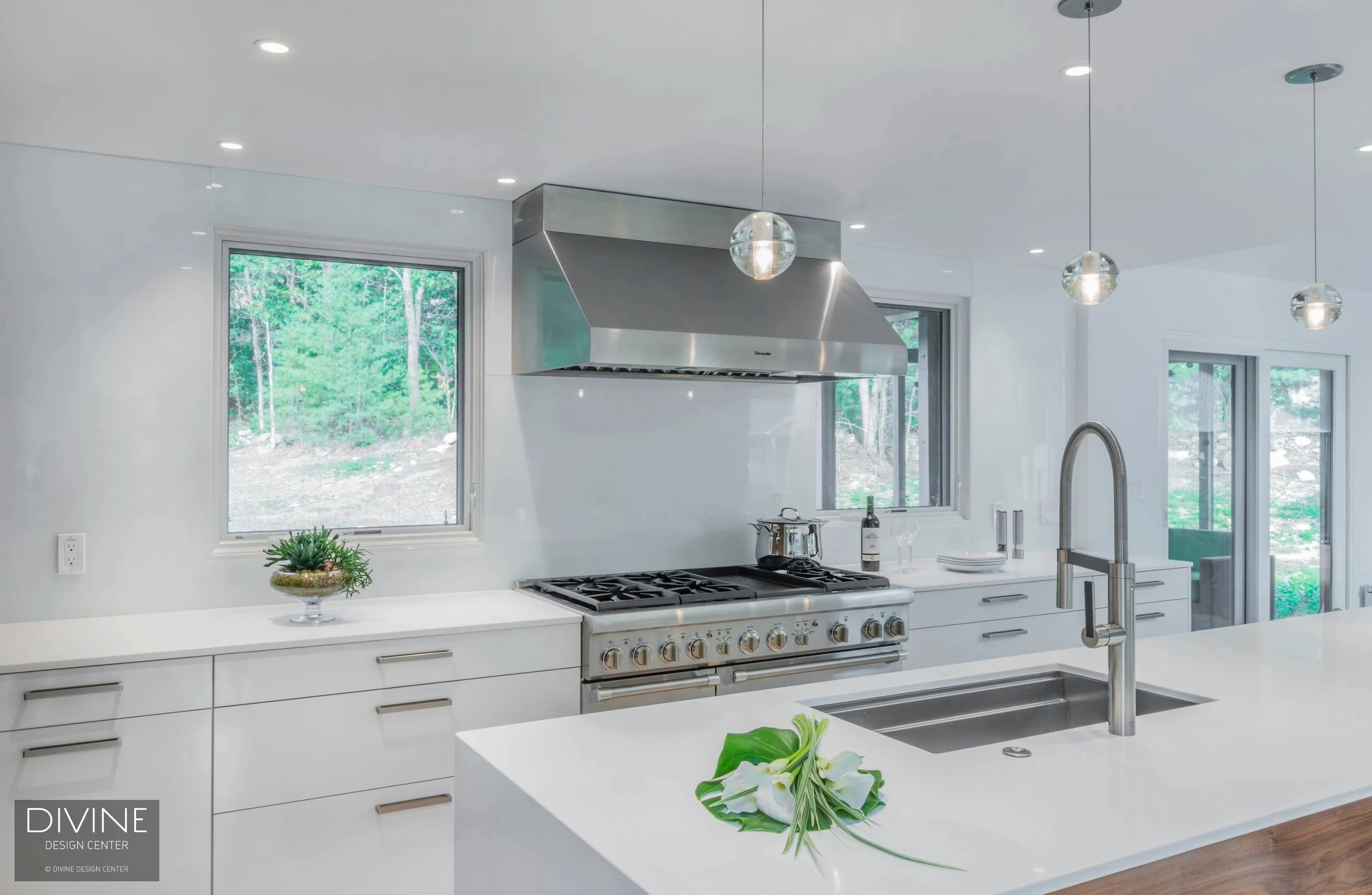 A unique touch that gives this custom kitchen a chic feel is the porcelain countertops. The bright white kitchen cabinets and counters give this German kitchen a crisp and uniform look that blends perfectly with the white custom cabinets.