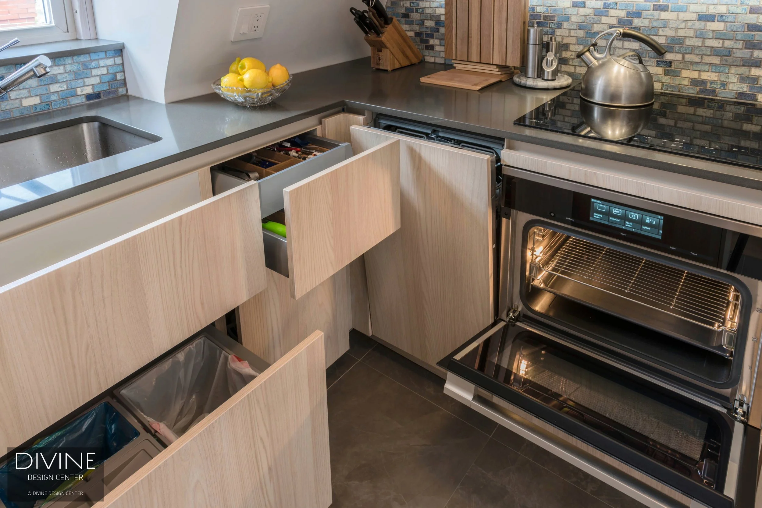 We started by adding Leicht custom cabinetry with a light wood veneer. We chose a handleless design for a streamlined look. We also added panel fronts to the appliances. This visually opens the space by creating a uniform look with hidden kitchen appliances. Meile professional appliances elevate this custom kitchen.