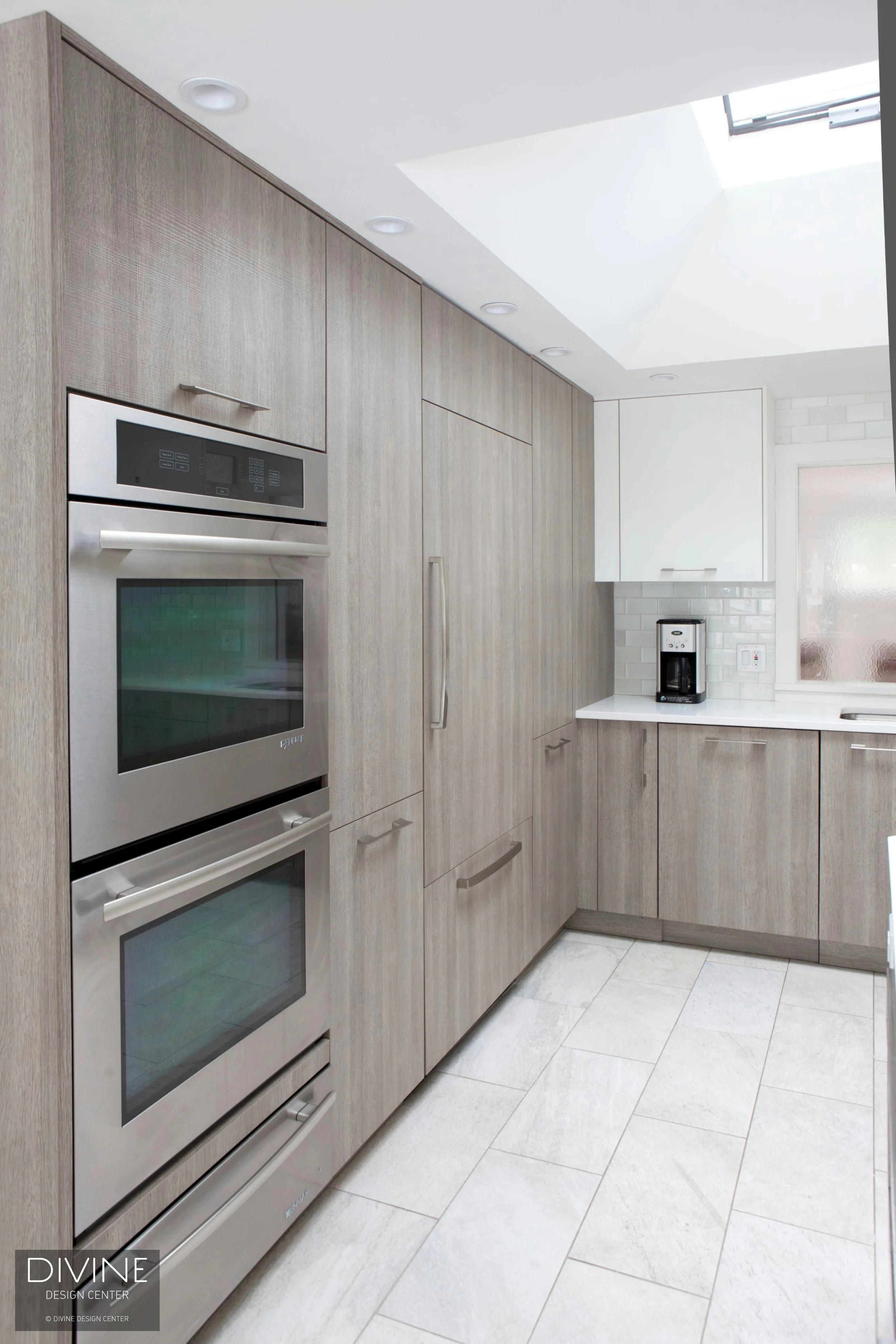 Lastly, the countertops are Silestone and part of the Lagoon collection. The clients opted for JENN-AIR appliances, and in that selected induction cooktop surfaces. Furthermore, the designer also custom-ordered a JENN-AIR built-in microwave, warming drawer, double oven, downdraft, and sink.