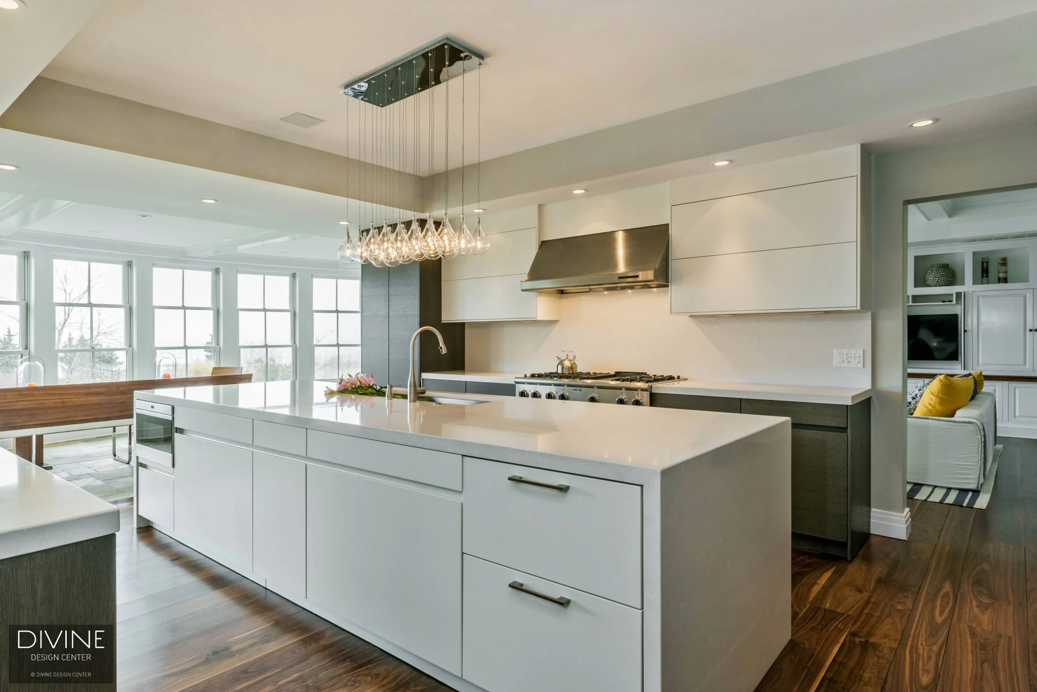 The big kitchen island extends the entire length of the kitchen with a waterfall countertop. Hanging from the high ceilings above the island is a contemporary Edison bulb chandelier.