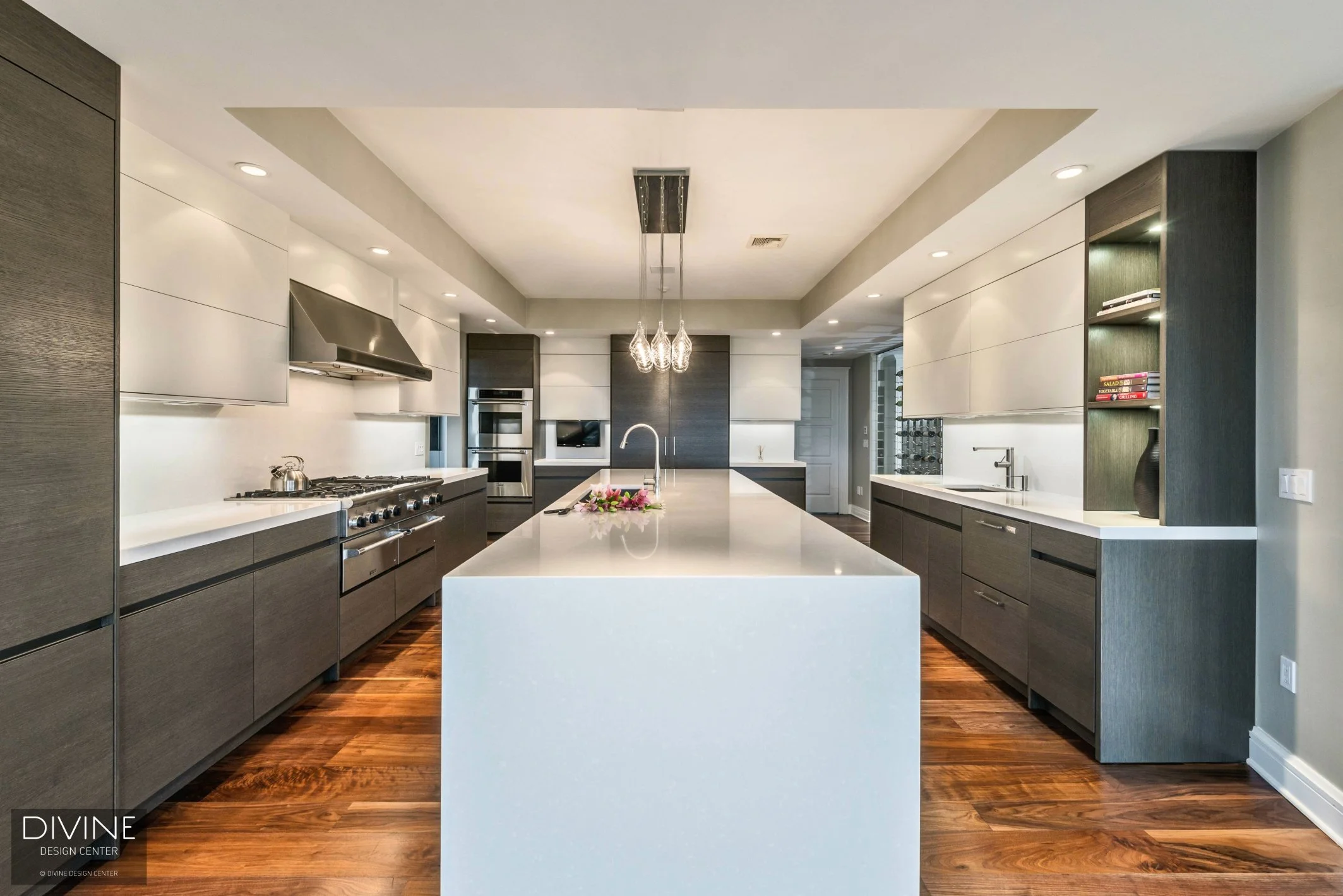 Throughout this custom kitchen are minimalist two tone cabinets with a handleless design. A dark grey oak and gloss white veneer were used for a contemporary look. These neutral finishes look sophisticated when paired with the medium natural wood tones of the floor.