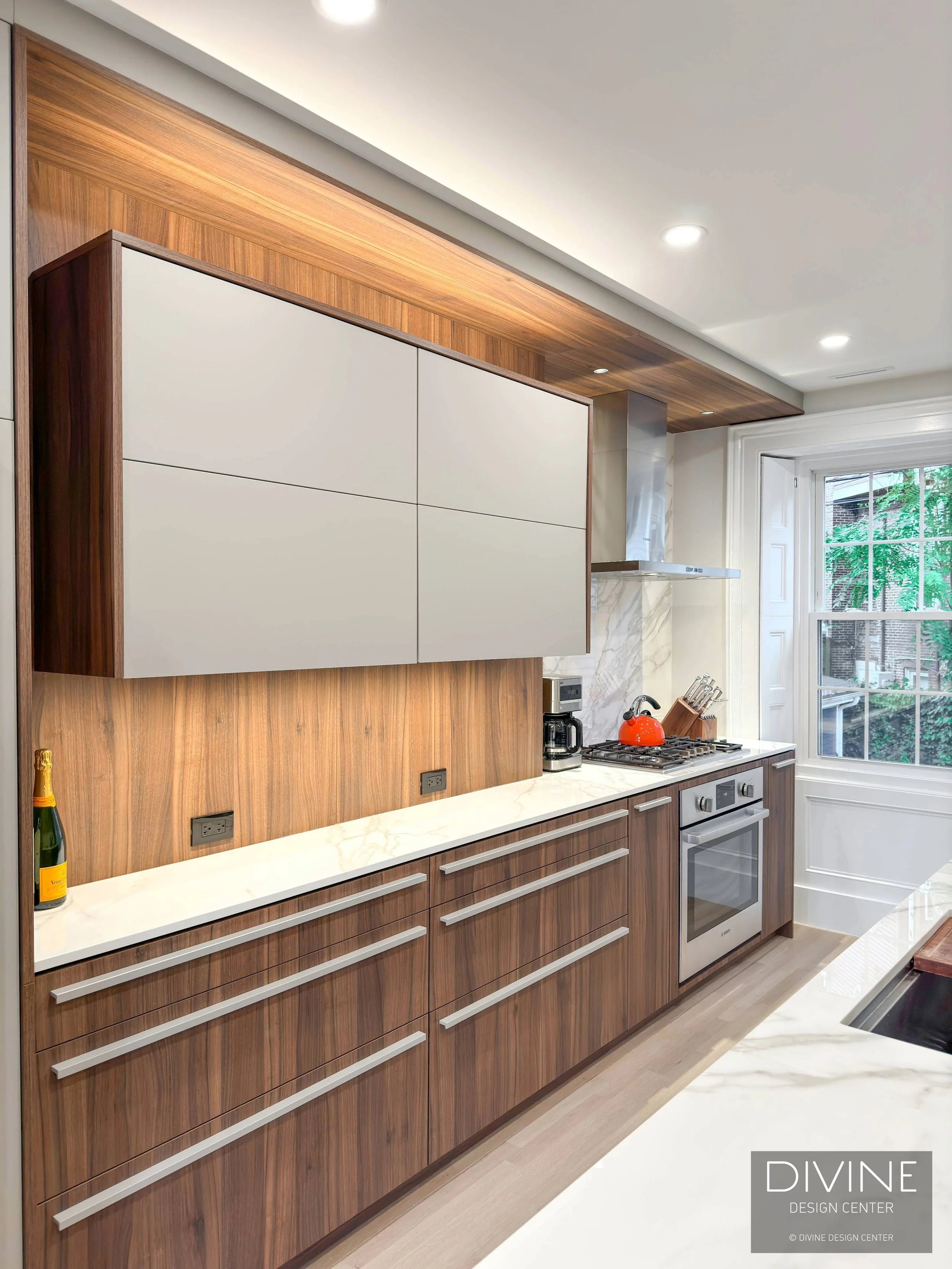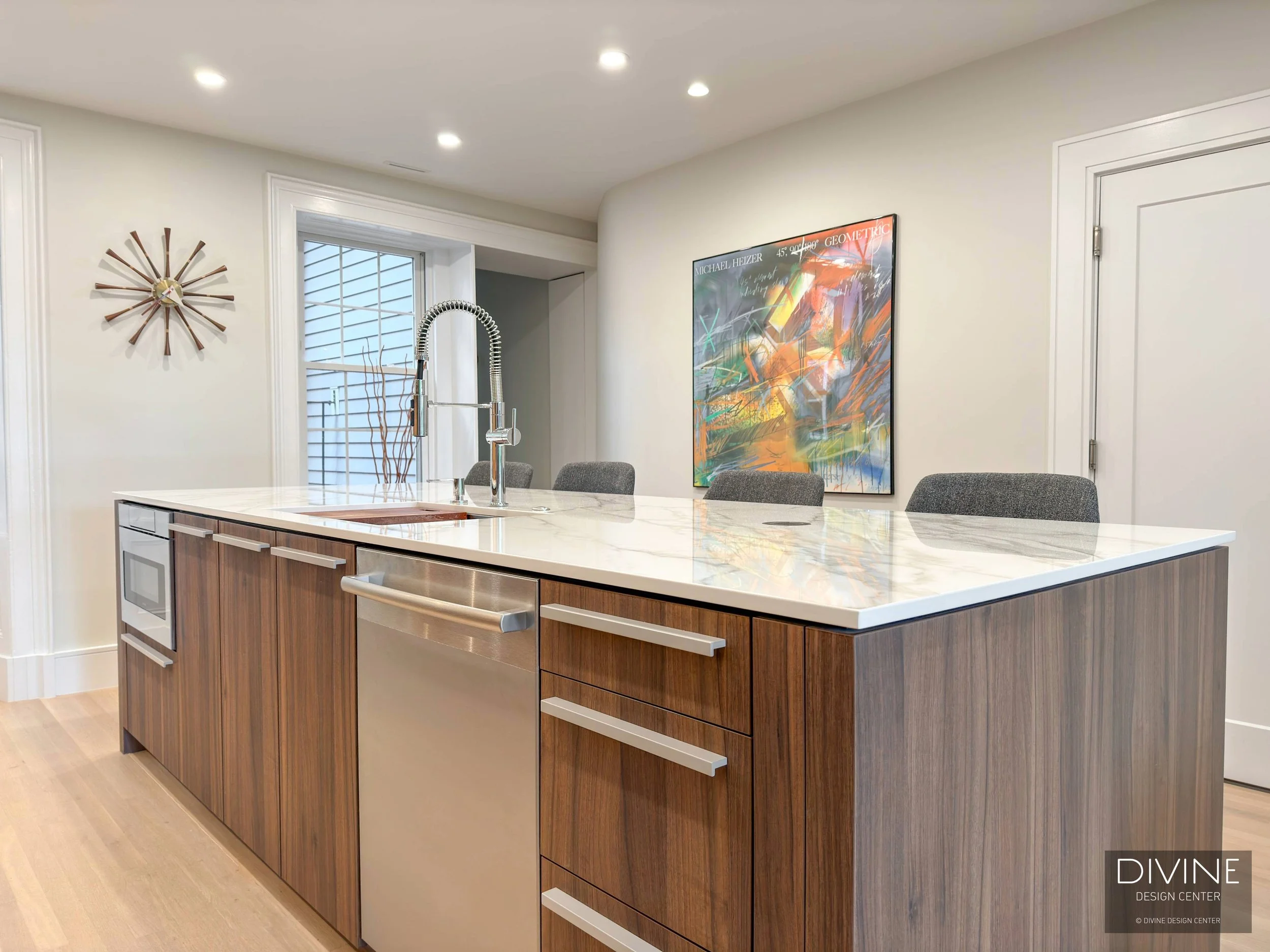 This Charlestown homeowner loves natural wood tones, and we were happy to oblige with his gorgeous design, topped off by floating set up upper swing-up cabinets.